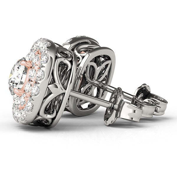 A beguiling pair of halo style earrings with brilliant diamonds and a classic cushion outer shape. Made of 14k white and rose gold, these beauties come with push backs.